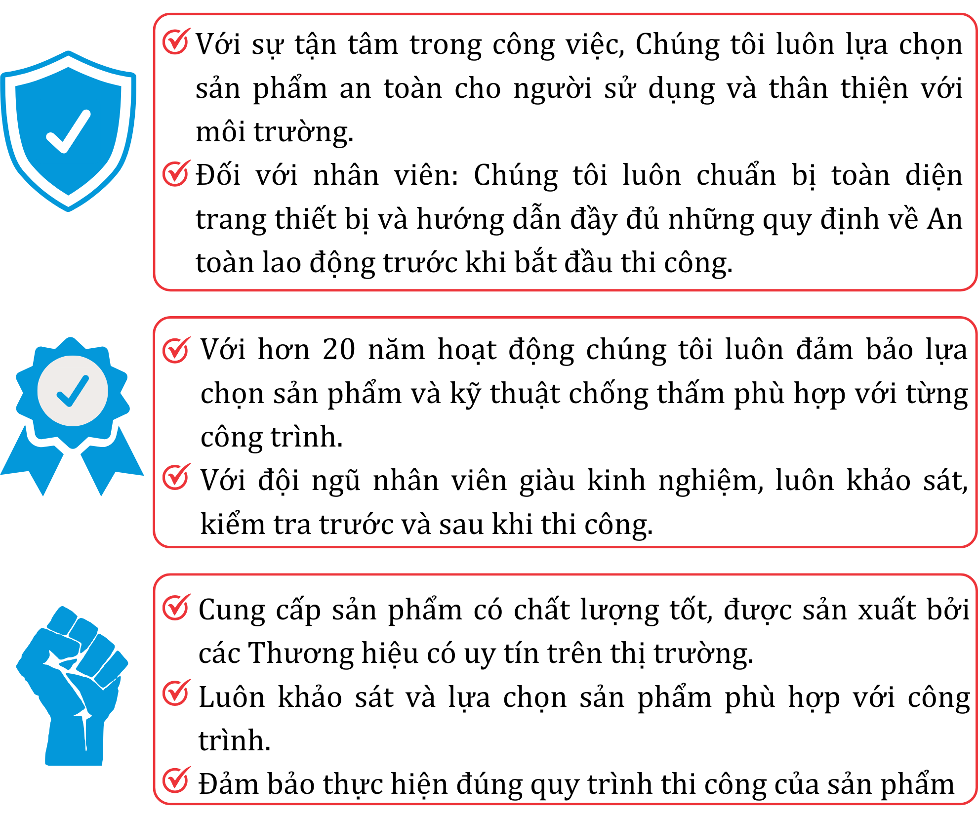 Với mục tiêu trở thành một trong những nhà thầu về lĩnh vực thi công chống thấm hàng đầu Việt Nam, chúng tôi đặc biệt chú trọng đến An toàn, Chất lượng và Tiến độ để đáp ứng tốt nhất mọi yêu cầu của Khách hàng.